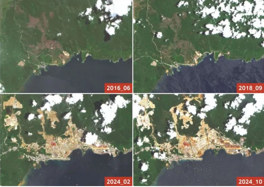 Sentinel-2/ Copernicus Dataspace dalam Laporan Nexus3. Area menggambarkan Teluk Weda sebelum dan sesudah berdirinya PT Indonesia Weda Bay Industrial Park (IWIP) dalam rentang 2016-2024.