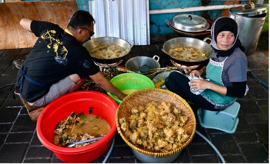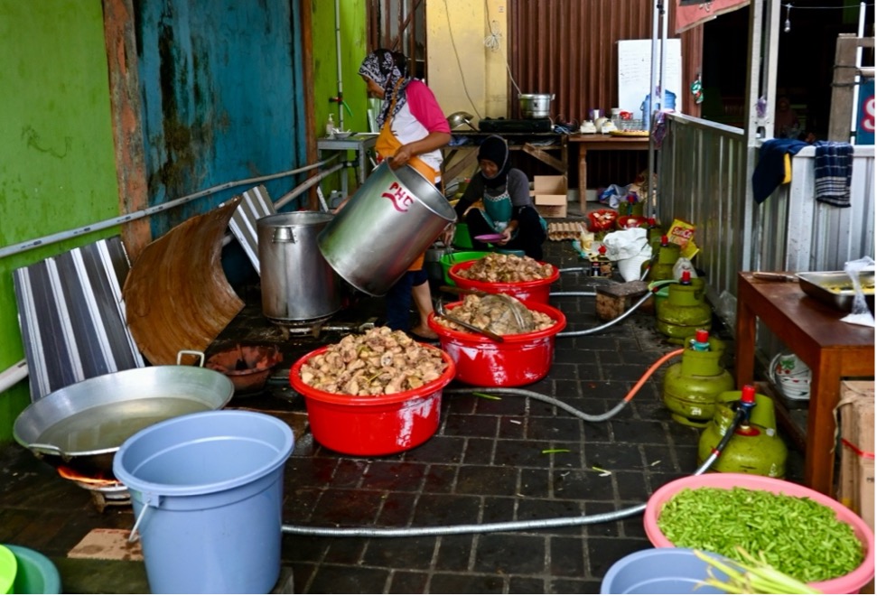 Approximately 250 kilograms of rice for is prepared at the mosque every day. Other components of the meals are prepared offsite by groups of volunteers, each including fifteen to twenty-five people most of the them women, on a rotating basis. They typically include chicken, beef or mutton, vegetables, sambal (chilli) and krupuk (cassava crackers). Each meal cost approximately Rp15,000 (1 US dollar). This is somewhat less than a similar meal would cost in a warung (food stall). This year there were twenty-nine groups of volunteers. We followed one that worked from a small restaurant near the mosque that was closed during Ramadan.