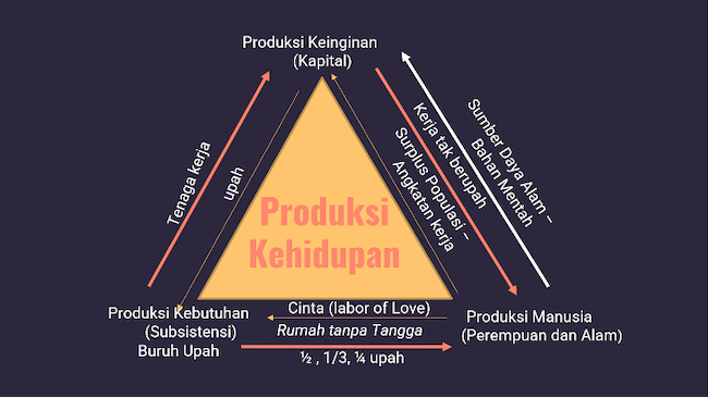 Saya mengembangkan sebuah skema untuk memahami perubahan produksi kehidupan (fig.3) untuk memperlihatkan berbagai perubahan cara hidup. Pertama, salah satu perubahan mendasar dari cara hidup adalah: adanya kecenderungan dari individu di pedesaan untuk menggantungkan produksi kebutuhannya pada kerja upahan (baik secara permanen ataupun secara berkala). Alam sebagai sumber produksi kebutuhan dikuasai oleh produksi keinginan dibawah kapitalisme, sehingga cara manusia memenuhi kebutuhan mendasarnya pun mengalami perubahan. Kedua, perubahan produksi kehidupan juga mempengaruhi posisi Perempuan. Kapitalisme mendevaluasi kerja perempuan sebagai aktor utama produksi manusia. Disini peran utama dalam produksi manusia, hamil – melahirkan – membesarkan anak dianggap tidak memberikan kontribusi kecuali mempersiapkan tenaga kerja. Ketiga, hubungan antara produksi kebutuhan yang umumnya dilakukan laki-laki membentuk cara hidup dan hubungan dengan Perempuan yang memproduksi manusia. Pada gilirannya membentuk hubungan asimetris antara mereka yang memproduksi kebutuhan subsistensi dengan mereka yang memproduksi manusia.
